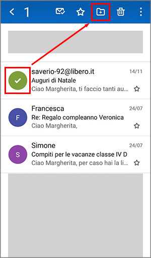 A questo punto puoi spostare le email di Natale nell’apposita cartella. Basta selezionarle dall’elenco e poi toccare l’icona a forma di cartella presente nel menu orizzontale in alto.